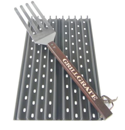 Up your searing game with these two 16.25″ GrillGrate panels with tool. The photo shows two panels side by side totaling 10.5″ in width.Â