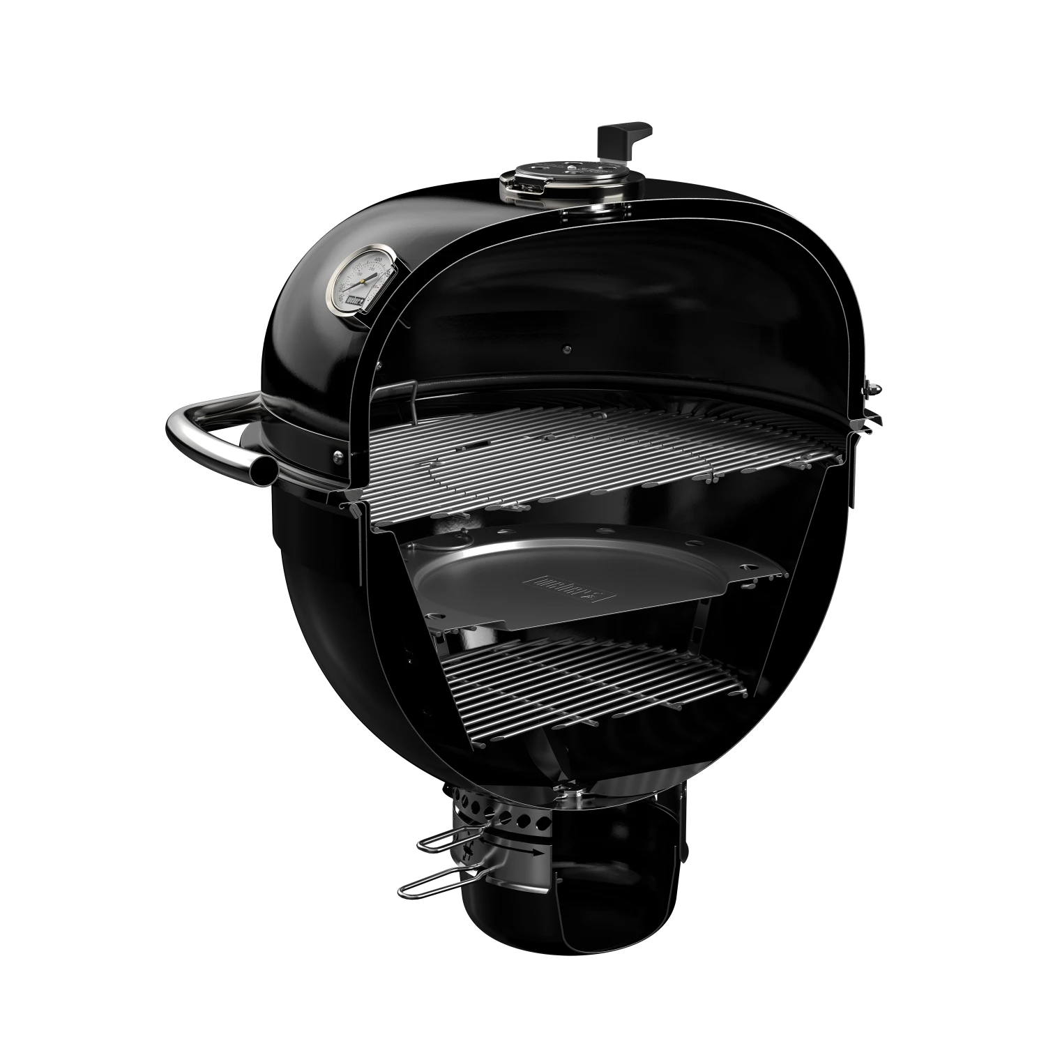 - Charcoal grate can be positioned two ways to adjust for temperature (closer = hotter, lower = cooler)